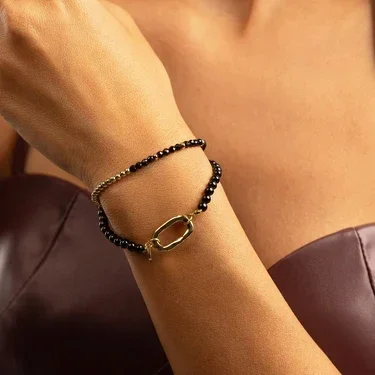 De Onyx armband straalt kracht en elegantie uit. Handgemaakt met Onyx edelsteen kralen en afgewerkt met een stainless steel sluiting met 14k gouden plating, is dit een tijdloos sieraad dat bij elke outfit past.