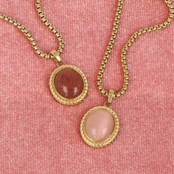 Deze goudkleurige vintage ketting met pink moonstone heeft een verfijnde en elegante uitstraling. De edelsteen van ca. 1.1 x 1.3 cm vormt een subtiel detail aan de fijne ketting en geeft het sieraad een zachte, chique touch. Dankzij het gebruik van stainless steel met 14K gold plating is de ketting duurzaam en comfortabel om dagelijks te dragen. Mooi om solo te dragen of te combineren voor een zachte, gelaagde look.