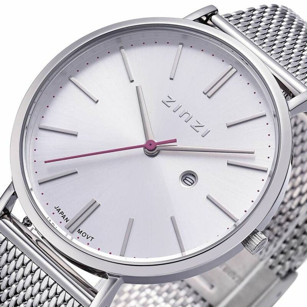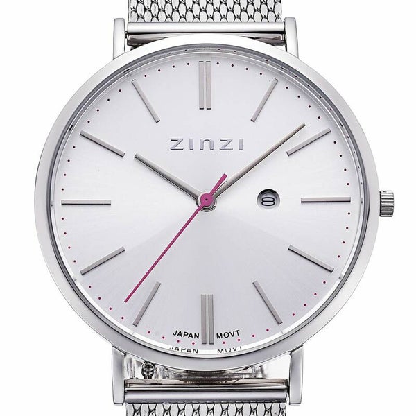 Het nieuwe Zinzi Retro horloge is klassiek, trendy en tijdloos tegelijk. Geïnspireerd op de 'seventies', maar met de bekende Zinzi touch ontworpen. Het extra dunne Japanse uurwerk met datum en de platte ronde stalen zilvergekleurde kast (38mm) zorgen voor een elegante maar fashionable look. Voorzien van een zilveren 'sunray' wijzerplaat en stalen mesh band in de kleur zilver. De band is eenvoudig te verwisselen door het handige schuifsysteem aan de achterkant. Leuk detail: de felroze 'Zinzi' seconde wijzer, de speelse ronde dag-aanduiding, de subtiele roze puntjes op de wijzerplaat om de seconden aan te geven. Ook 5atm waterbestendig (tegen regen en spatwater) en met sterk mineraal glas. Want kwaliteit staat bij Zinzi voorop.